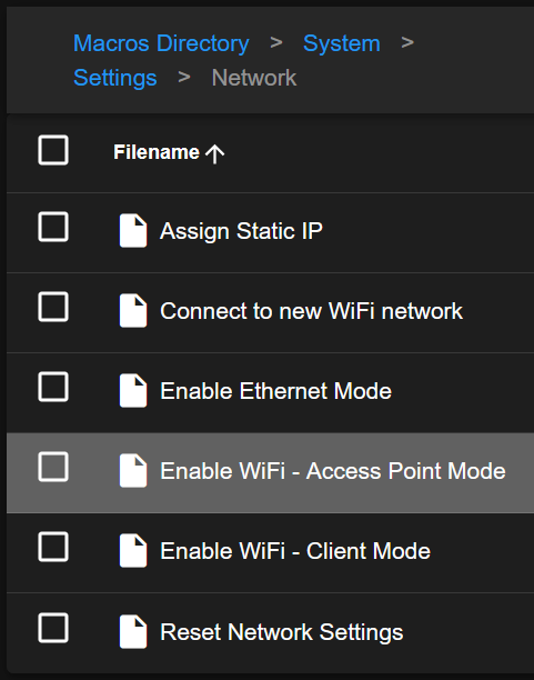 Macro Location: Macros > System > Settings > Network > Enable WiFi - Client Mode