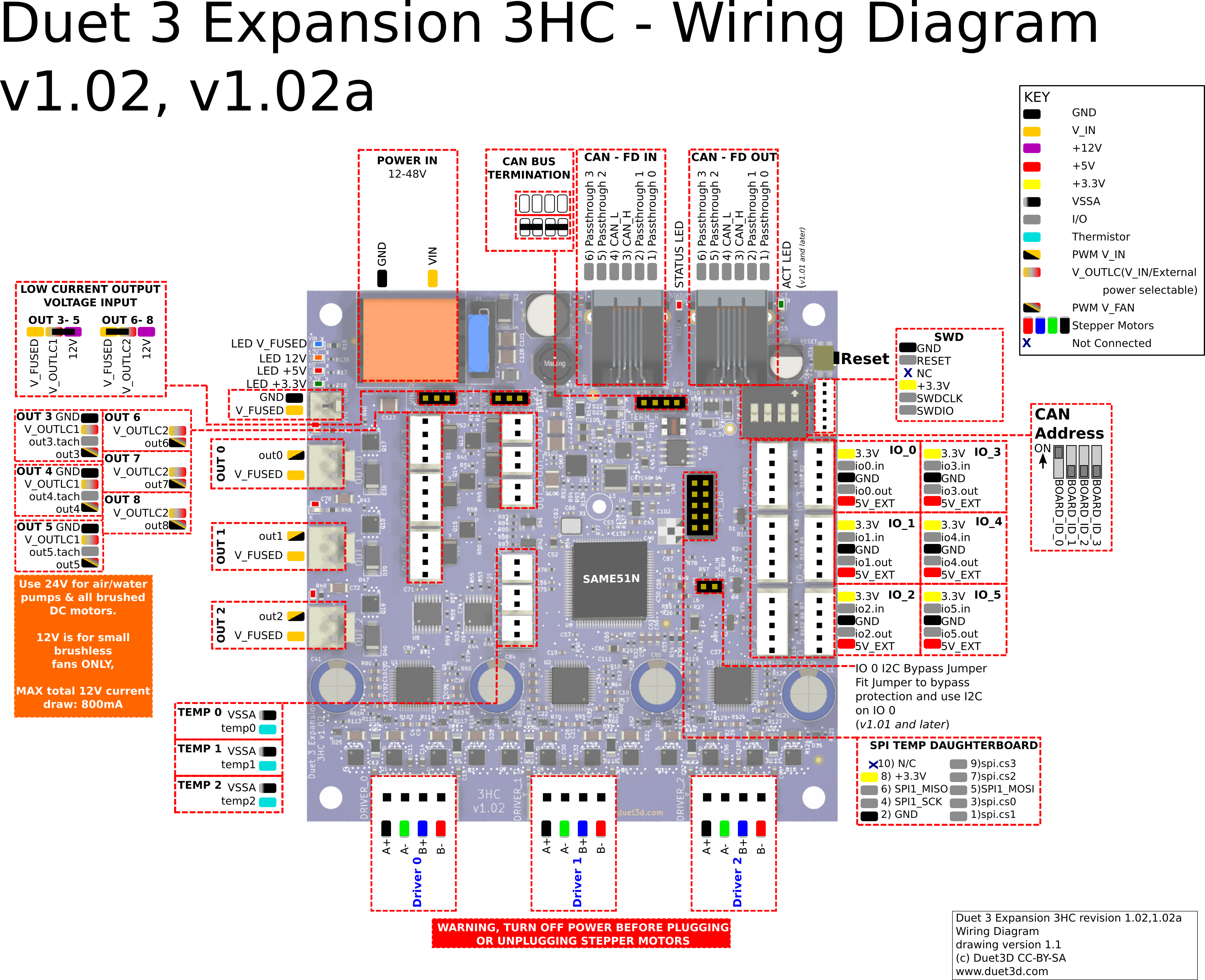 This article covers the complete wiring schematic of the Vision Miner 22IDEX V4. Use it as a reference when troubleshooting electrical connections, replacing components, or verifying wiring after maintenance. The printer uses two controller boards: a Duet 3 Mainboard 6HC (Board 0) and a Duet 3 Expansion 3HC (Board 1), connected via CAN-FD bus.