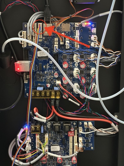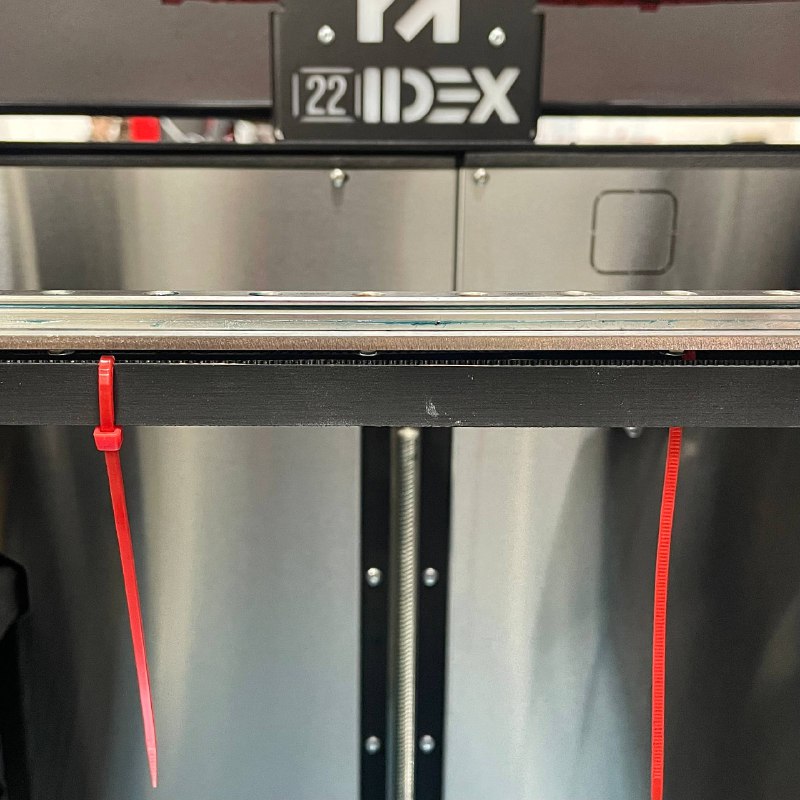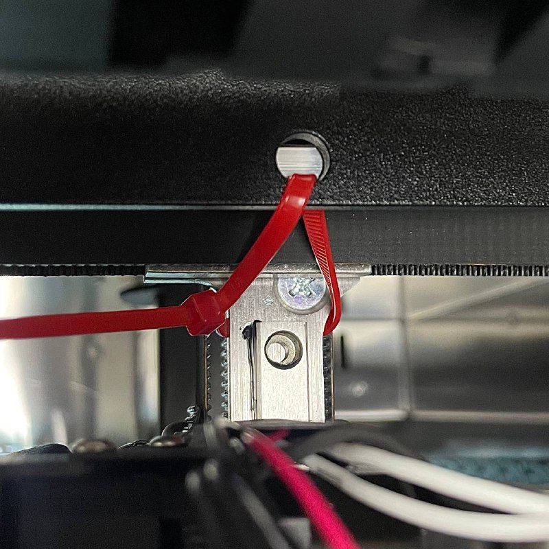 - Open the lid and front door to cut the 4 red zip ties on the belts using side wire cutters. Be careful not to damage the belts.