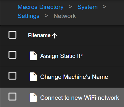 Navigate to Macros > System > Settings > Network and click Connect to new WiFi network.