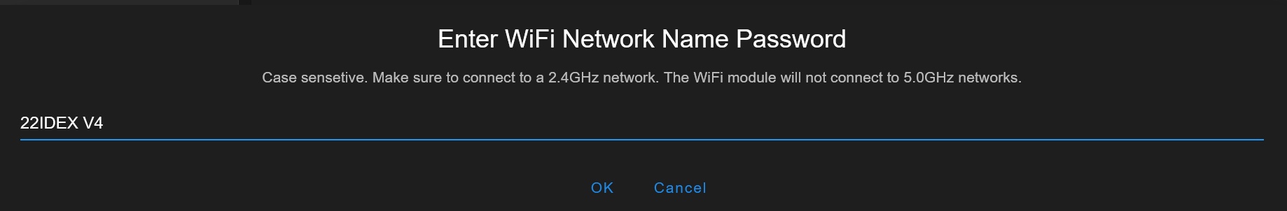 Note: The 22 IDEX V4 WiFi module only supports 2.4 GHz WiFi networks. It will not connect to 5 GHz networks. Ensure your router broadcasts a 2.4 GHz SSID before attempting to connect.