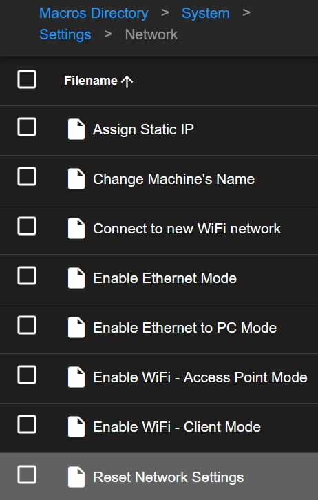 Warning: Resetting network settings will erase all saved WiFi networks. You will need to reconnect to your WiFi network using the "Connect to new WiFi network" macro.