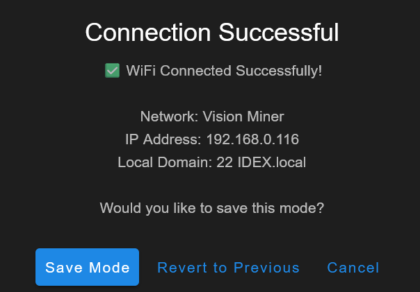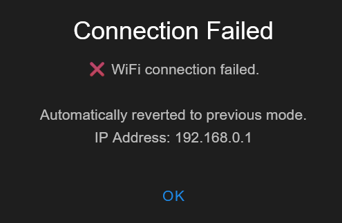Note: Switching to WiFi Client mode will disconnect your current session temporarily. You will need to reconnect to your regular WiFi network and access the printer using its new IP address.