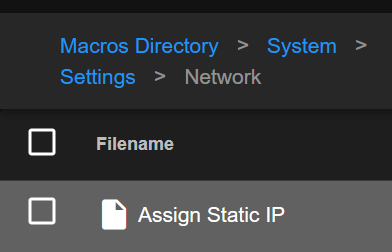 IP_address.txt to view connection details (includes network mode, IP address, and timestamp)If your network requires a static IP address instead of DHCP, use the built-in Assign Static IP macro.