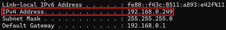 ipconfig, look for "IPv4 Address"ip addr or ifconfig, look for Ethernet interface IP
