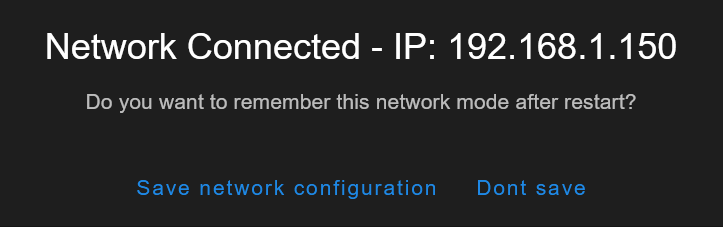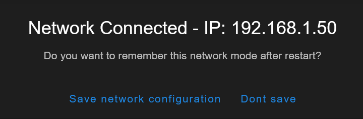 Pop-up Title: Network Connected - IP: 192.168.1.50