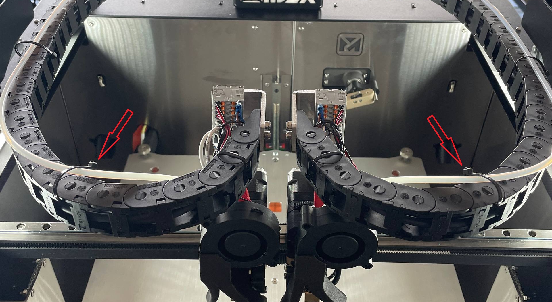 Cut the front zip tie - the one closest to the extruder head - on each cable chain. This frees the PTFE tube to take a wider, gentler path near the toolheads and reduces the forced bends that cause filament to snap.