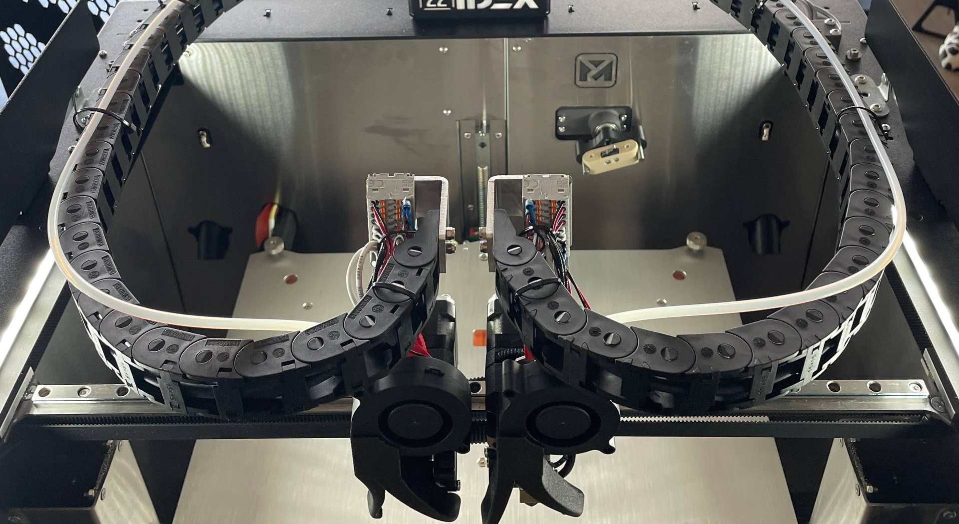 The XY motion system on the 22IDEX V4 has two cable chains (one per toolhead). Each cable chain has three zip ties securing the PTFE tube: one at the back, one in the middle, and one at the front near the extruder.