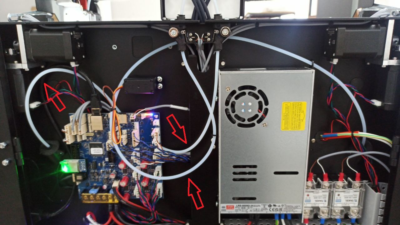 By default, the PTFE tubes in the rear electronics bay are neatly routed through holders and clips to keep them contained within the enclosure. This routing creates tight bends that rigid filament cannot tolerate. Rerouting the tubes to bypass these holders gives them significantly more freedom.